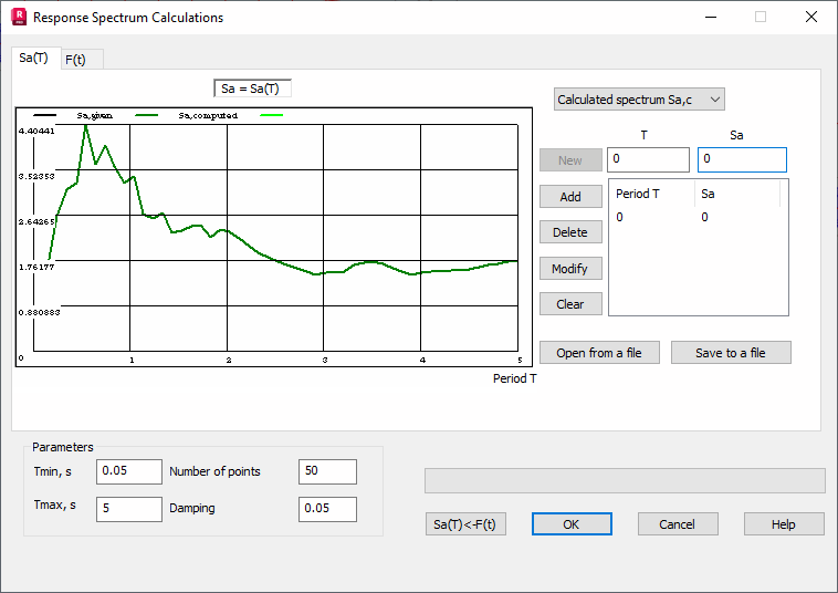 In order to define a new function, click New. Add, Delete and Modify edit a selected line in the table containing columns Period T and Sa. Click Clear to delete all spectra.