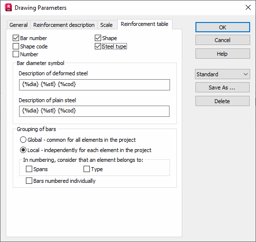 While grouping, the following bar properties are used: steel type, diameter, geometry and shape code. If all these properties are identical for several bars, they can belong to one group.