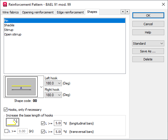 The Shapes tab allows you to shape elements of transversal and longitudinal reinforcement.