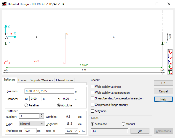 Use this option to perform detailed analysis of I-section members, rolled or welded. Access the option by clicking the Detailed button in the detailed results dialog for the EC3 code.
