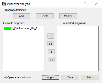 After diagrams are defined and moved to the Presented diagrams field in the Pushover analysis dialog, clicking Apply displays a view with the selected diagrams. The diagrams are presented in the same manner as for time history analysis.