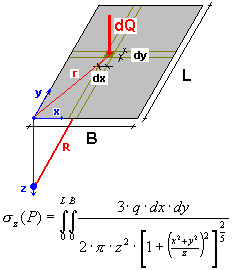 Solutions to the above equations for corner points of the rectangular area, under the center of the rectangular area as well as for an average value under the rectangular area, are given in the literature. To obtain a value of the average stresses under the rectangular area use the following formula. After integration, it assumes the form applied in the calculation algorithm.