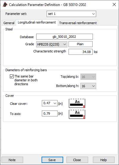 Below, diameters of bars for reinforcement of an element are determined. The bars are listed in metric diameter units for top/bottom reinforcement. Bar diameters can be different for top and bottom reinforcement of a beam. Similarly, a column can have reinforcement along h and b sides. If the same diameters are used for the entire element, The same type of reinforcement in both directions option should be selected.