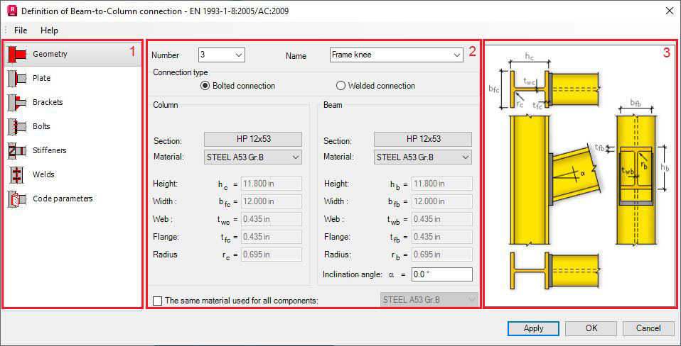 - In der Mitte definieren Sie die Parameter eines ausgewählten Elements der Stahlverbindung.