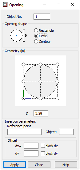 Specify the coordinates of a point from which the values of the offset dx and dy are measured. The number of the active object in which the opening will be defined is displayed in the Object field.