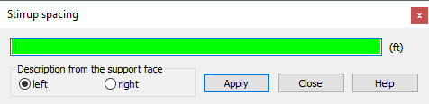 The option is used for manual modification of the spacing of stirrups (in beam transversal reinforcement). It is available after selecting the Reinforcement / Stirrup Spacing command from the menu.