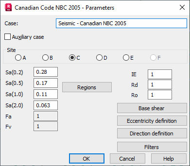 Parameters of a structure seismic analysis depend on a seismic code used during calculations of a structure influenced by seismic loads. Select Canadian seismic code NBC 2005 in the New Case Definition dialog or click Parameters in the Analysis Type dialog.