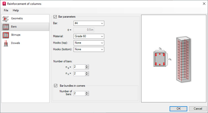 Verwenden Sie die Option Stabbündel in Ecken, um die Bewehrungsfläche zu erweitern. Wenn es nicht möglich ist, die Anzahl der Bewehrungsstäbe unter Beibehaltung des entsprechenden Abstands dazwischen zu erhöhen, können Sie Stabbündel (2 bis 4 Stäbe in einem Bündel) in den Ecken des Querschnitts einsetzen.