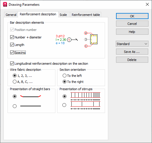 - In the Drawing Parameters dialog, select the Reinforcement description tab and set your preferences.