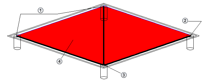 The use of rigid links can be illustrated by defining a floor which is rigid in its plane, whereas, in the direction perpendicular to the floor plane, it is pliant. A rigid link is defined as a rigid membrane linked with a primary node, to which secondary nodes with a selected set of degrees of freedom are attached. (To achieve full rigidity, all degrees of freedom for the secondary nodes should be selected.) When using rigid links, it is possible to model a membrane (see the following image) - the directions UZ RX RY RZ in the secondary nodes are released.