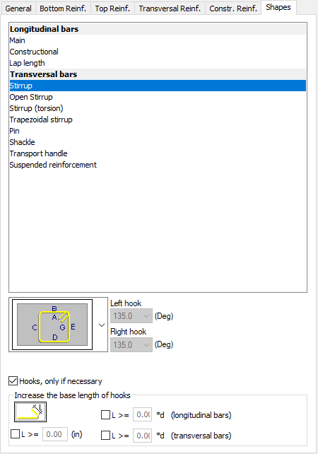 Options in this dialog let you select shapes of the longitudinal and transversal reinforcement. For cross bars, the pin or stirrup shape is selected. For transversal bars you can select a preferred shape of a stirrup, pin or transport handle. The longitudinal bar shape (ends) are set in a similar way with differentiation between main and structure bars. You can select the end type for each end of the bar in the shape of a hook, bent at any angle.