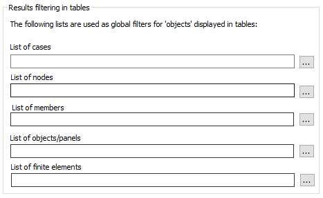 Note: If the fields located on this tab are empty, calculations will be performed for all of the load cases, nodes, bars, panels, objects and finite elements defined in a structure.