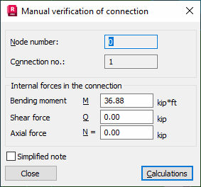 After clicking the Calculations button the software runs calculations of the selected connection type for a given structure node. Define internal connection forces (M, Q, N).