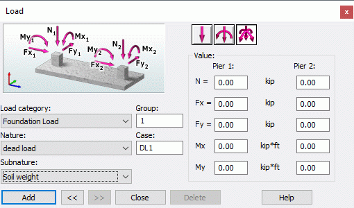 (Load definition) or select RC element > Loads to define the loads applied to a foundation.
