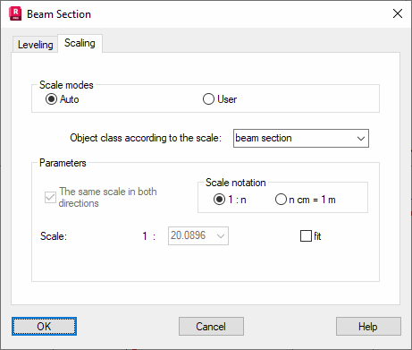 On the Scaling tab in the Beam section dialog, select the scale of the working drawing displayed on the screen.