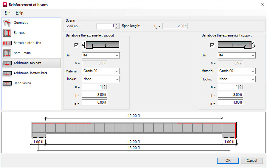 Die Bewehrungsstäbe werden separat für jedes Balkenfeld generiert. Zu den Parametern für diese zusätzliche oberen Stäbe gehören: