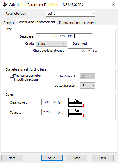 The Longitudinal reinforcement tab of the Calculation Parameter Definition dialog box for the Norwegian code NS 3473:
