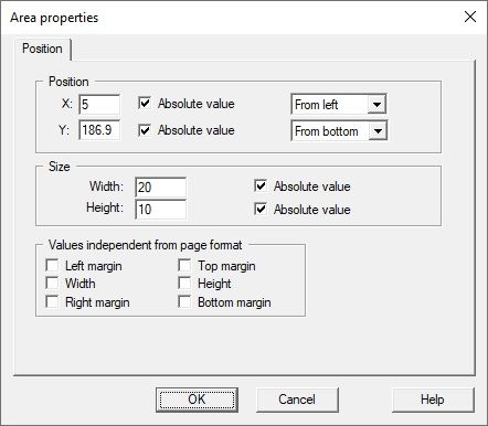 The Position tab contains the same options as the corresponding tab in the Text properties dialog box. Additionally, you can determine the size of the view and indicate which values are to be independent from page format (in the default configuration, all the values are recalculated proportionately by the Robot printout module when page format is modified).