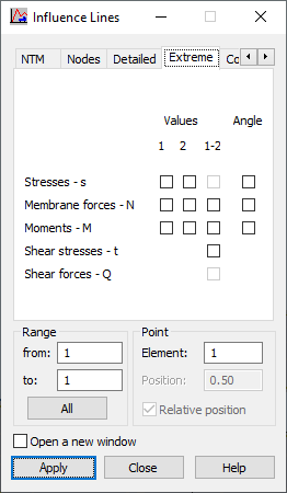 The options in the dialog let you indicate a surface-related quantity (defined for a plate or shell structure) for which the influence lines are presented: