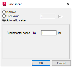 Use this dialog to select how to take account of the base shear force: calculate it according to the provisions of the seismic code (the Automatic value option) or specify it (the User value option).