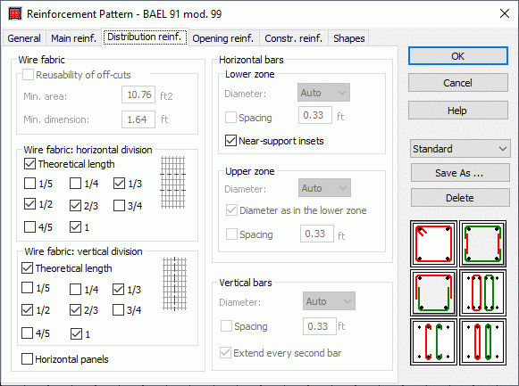 This tab is divided into two parts. The first refers to wire fabric, the second to reinforcing bars. Depending on the selection of distributed reinforcement type on the General tab of the Distributed reinforcement field, only one type of distributed reinforcement is active in the Distributed reinforcement tab.