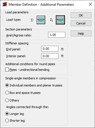 - Round pipes case conditions. If the Unidirectional bending of pipes option is selected, then, for this type of section, a bending moment equal to a sum of moments operating along axis Y and Z is calculated; the resultant moment is the basis for bar design.