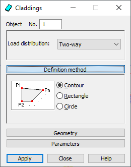 Definition method selects a method of defining a cladding (Contour, Rectangle or Circle); selecting one of these options determines the definition method.
