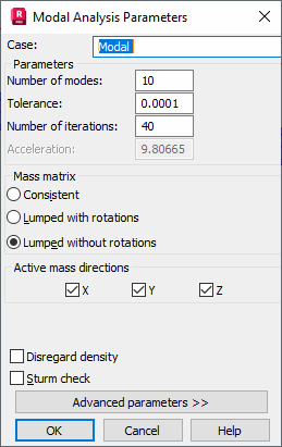 Click Advanced parameters >> to access additional modal analysis parameters for a load case: