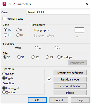 Parameters of a structure seismic analysis depend on a seismic code used during calculations of a structure influenced by seismic impact. Select French seismic code AFPS ("Recommendations Association Francaise du Genie Paraseismiques 90") or PS 92 ("Regles Parasismiques Francaise 1992") in the New Case Definition dialog or click Parameters in the Analysis Type dialog.