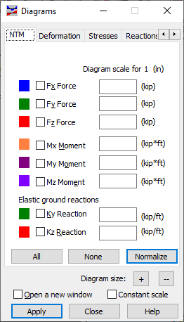 - Moments: MX, MY and MZ (when one of these options is selected, the MX, MY or MZ moment diagram displays) .