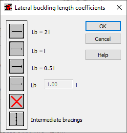 The dialog contains typical member support conditions based on the buckling length coefficients chosen. Due to the possibility of affixing the upper or lower flange separately and the occurrence of compressive stresses in either flange under various load cases, two lateral buckling lengths are available. The proper lengths are controlled by the coefficient by which the base length of the member should be multiplied to obtain the lateral buckling length. The length Iz is taken as the base length. You can either enter the coefficient value directly or it is chosen automatically by clicking the icon of the typical support conditions case.