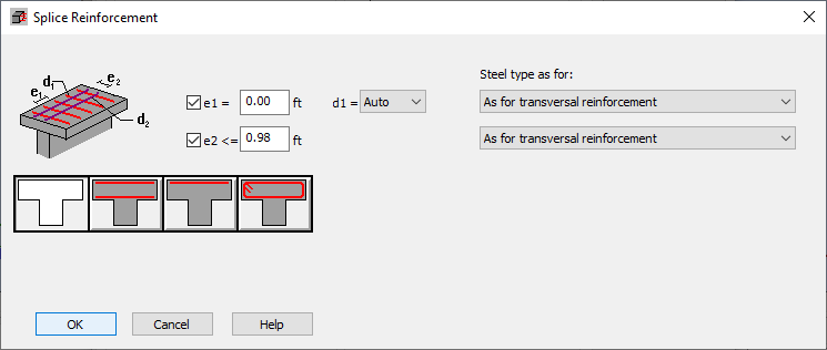 Pressing the Splice reinforcement button in the Reinforcement pattern dialog box (Structural reinforcement tab) results in displaying the dialog box shown below.