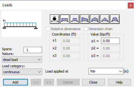 If continuous load type is selected, the Dimension Chain option appears. If this option is active, (the symbol √ appears), a so called dimension chain will be used while defining a continuous load. This signifies that the continuous p2 load value will be applied at a concentrated with the coordinate (x1+x2), the p3 load value at a concentrated with the coordinate (x1+x2+x3) etc.If the option is inactive, the load p1 is applied at a concentrated with the coordinate x1, the load p2 at a concentrated with the coordinate x2 etc.