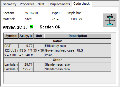 Click the Code Check tab in the Member Properties dialog for an RC member (after calculation of reinforcement theoretical (required) area) to display the following: