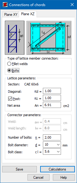 After the verification of a complex member you can select and verify elements connecting individual member chords. Analysis of chord connections in a complex member is run by clicking the Lattice button in the RESULTS - Code dialog. The Connection of Chords dialog consists of two tabs containing data about connectors in planes XY and XZ needed for calculations. For each of the planes the analysis is carried out independently.