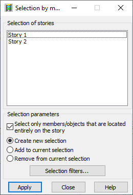 The top of the dialog lets you select structure elements using stories. These elements include: nodes, bars, objects, or finite elements.