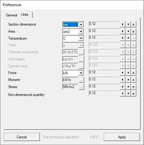 The Units tab of the Preferences dialog selects units used in fire resistance calculator.