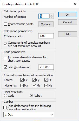 In the middle part of the dialog box, it is also possible to choose internal forces to be taken into account in member code calculations; switching on an option (e.g. Fx) results in the Fx force being considered in calculations. Moreover, units for presentation of results of the member design may be selected here. The results may be presented in the units used in the Japanese steel code, or in the units applied in the Robot program.