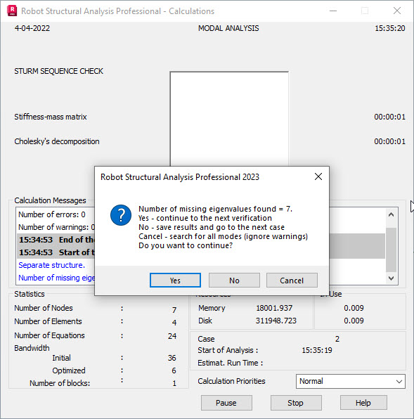 Sturm check is checked. Skipped frequencies for first N modes are missing. It is available for direct solvers when BLSI, SI or Lanczos methods are applied. It is not available for the basis reduction method and for all iterative solver methods. Define N first sequential eigenmodes. Sturm check is performed. If skipped frequencies are detected, a warning prompts the number of skipped frequencies. If instructed Yes, then iteration process is continued while the number of skipped eigenpairs is determined. Afterwards, Sturm check is repeated. No, then converged eigenpairs are saved as a final result and the next case is calculated Cancel, then iterations are continued while all skipped frequencies are determined. Warning is ignored. Sturm check is unchecked. Sturm check is not performed |