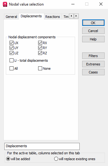 - UX, UY, UZ - If selected, they add table columns to display node displacements in the direction of X-axis, Y-axis or Z-axis, respectively, (global bar coordinate system).
