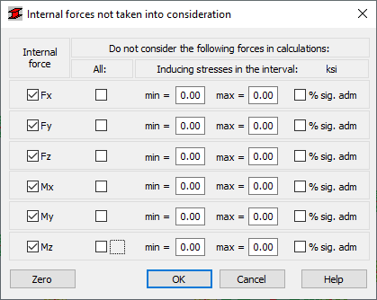 Use this option to determine the limit values of internal forces; thus the force values 'negligible' for a specific section may be disregarded. Access the option by clicking the Exclude internal forces from calculations button in the Configuration dialog.