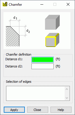 - In the Selection of edges field, specify (or highlight in the drawing area) edges (at least 2 edges) for which a chamfer is to be defined.
