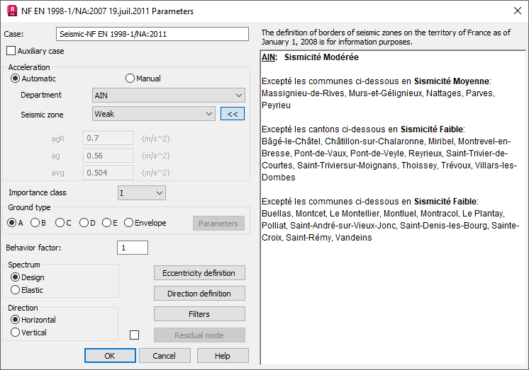 After selecting the Automatic option, you can define values of the reference acceleration automatically by specifying a department and a seismic zone. Click >> to extend the list of zones for a selected department. The definition of borders of seismic zones on the territory of France as of January 1, 2008 is only for information purposes.
