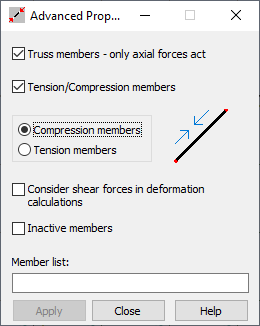 This option is used to specify additional properties for structure members such as: truss members (for which axial forces act), members which can perform only in tension or compression, as well as members for which the influence of shear forces on structure deformations is considered. Open the Advanced Properties dialog using either method: