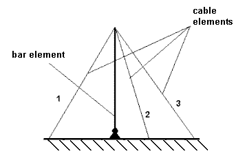 The model which is displayed can be a model of a whole structure or a part of a larger structure. If in the definition of a cable, random values of the assembly tension forces are assigned to cables numbers 1, 2 and 3, then most likely it will be impossible to fulfill the equilibrium conditions for the horizontal direction (the total for the horizontal components of tension forces from all three cables would need to be equal or close to zero). Therefore, the calculation process for this structure is not convergent or calculation errors occur. Such errors are typical of abnormally large displacements and rotation angles of structure nodes (to fulfill the equilibrium conditions, abnormally large rotation angles are defined in the structure, which frequently results in exceeding the domain of the functions: acos, asin, or root).