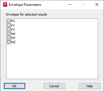 - Envelope only for selected results - This allows calculation of an envelope only for selected quantities (values of concomitants are shown for all the remaining quantities). Click Envelope to open the Envelope Parameters dialog with the list of results taken into account in calculation of the envelope. The Envelope only for selected results option is not available if the Envelope with concomitants option is deselected.