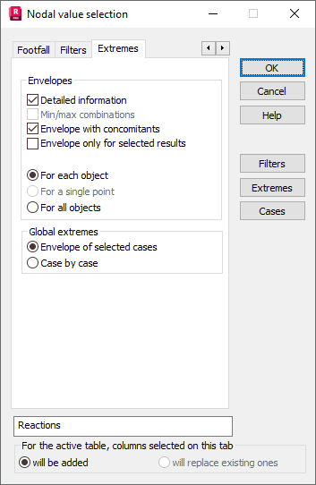 - Select For each object to search the extremes in all cases for each bar or panel (at all points or nodes). The minimum and maximum values separately for a whole bar or panel are obtained.