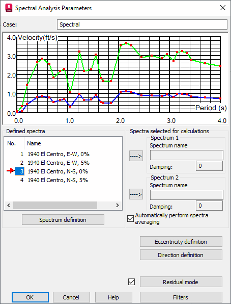 Structure spectral analysis will be performed for those displayed in the Spectra selected for calculations field. To choose a spectrum, select one of the spectra in the Defined spectra field and click the upper →. The spectrum and its damping value will be shown in the relevant fields. A diagram of the spectrum will display in the coordinate system.