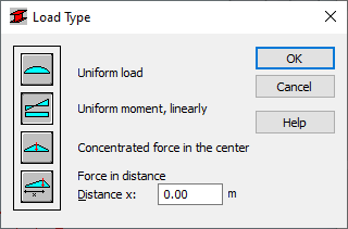 Automatic calculations occur when the character of the load changes together with the changes of load case. The "Constant Moment, Linearly" is the default option for all automatic calculations. Once a calculation case is selected manually, or the value of internal forces is defined by the user, the exact character of the load is determined.