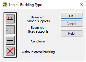 According to the code requirements, one of the models considered in the code must be accepted. The models are displayed as icons and represent the appropriate support positions from the code. Click the last icon to exclude the lateral buckling effects in the calculations.